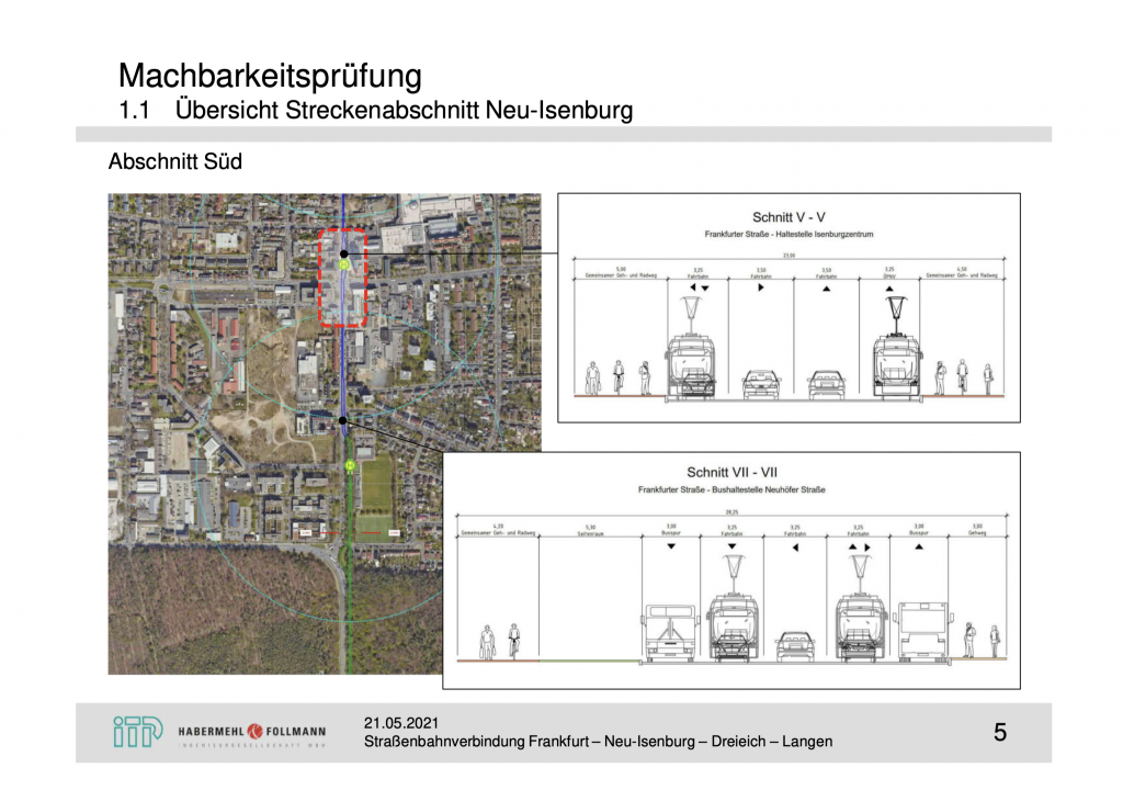 Schnitt V: An der Haltestelle Isenburgzentrum teilen sich der nach Süden führende Autoverkehr und der Linksabbiegerverkehr die Fahrbahn mit der Straßenbahn. Der nach Norden fahrende Autoverkehr, der Rechtsabbiegerverkehr und die nach Norden fahrende Straßenbahn bekommen jeweils eine eigene Fahrspur. Rad und Fußverkehr müssen sich den verbleibenden Raum in beide Richtungen teilen.