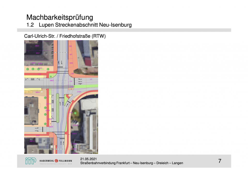 Die folgende Darstellung zeigt die sich kreuzende Streckenführung von Straßenbahn und RTW auf der Kreuzung Frankfurter Straße – Carl-Ulrich Straße / Friedhofstraße: