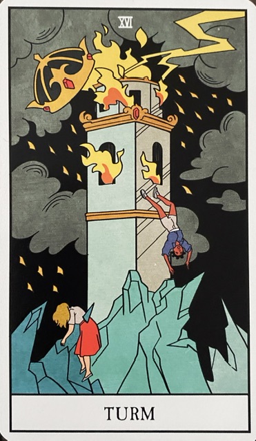 Turm: Radikale Veränderungen. Zerstörung unserer geschaffenen Strukturen. Auf der Karte wird ein Turm vom Blitze getroffen, die Kuppel, die wie eine Krone aussieht, stürzt bereits in die Tiefe, aus den Fenstern schlagen Flammen.