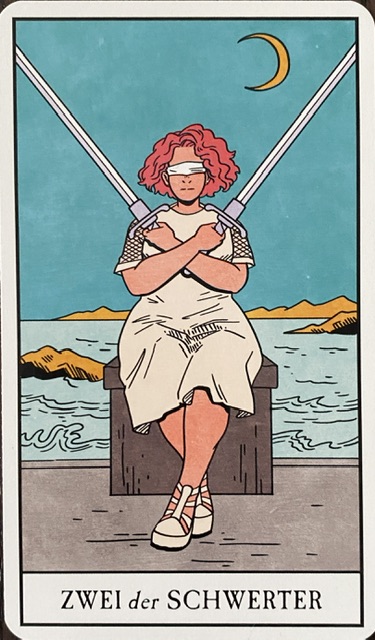 Zwei der Schwerter: Hier geht es um die Schwierigkeit, Entscheidungen zu treffen. Die Karte zeigt eine Person mit verbundenen Augen und zwei Schwertern, die in unterschiedliche Richtungen deuten. Welche ist die richtige?