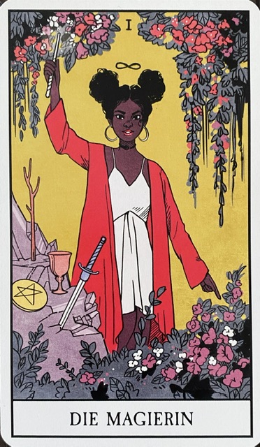 Der Magier (hier die Magierin): Kreation und Manifestation. Der Magier erschafft aus allen verfügbaren Energien (hier: Stäbe, Kelche, Schwerter, Münzen) etwas völlig Neues.
