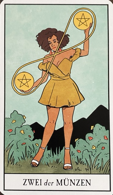 Zwei der Münzen: Diese Karte steht dafür, Dinge in Balance zu halten, im Fluss. Das gilt auch für gegensätzliche Kräfte, die im Gleichgewicht bleiben sollten. Die Karte zeigt in vielen Decks eine Person, die mit den zwei Münzen jongliert, eingerahmt von einer liegenden Acht, die für Unendlichkeit steht.