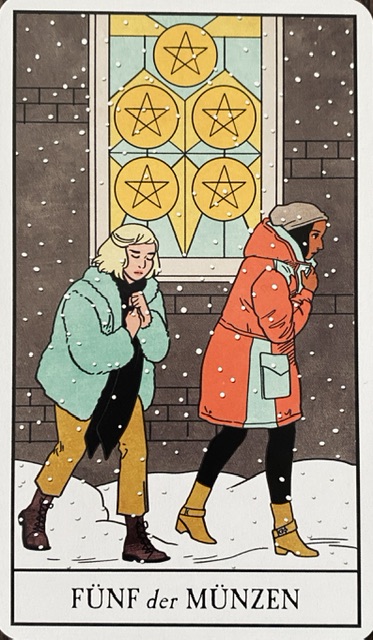 Fünf der Münzen: Die Karte zeigt zwei Personen, die in der Kälte draußen frieren müssen, während es hinter einem erleuchteten Fenster ganz offensichtlich ein ‚Drinnen‘ gibt. Das Motiv symbolisiert Schwierigkeiten (vor allem finanzielle), aber auch Hilflosigkeit, den Verlust von Sicherheit und das Gefühl, ausgeschlossen zu werden.
