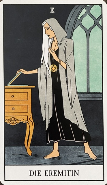 Der Eremit (in diesem Deck die Eremitin): Das Thema dieser Karte ist Rückzug. Das kann bedeuten, das man in sich geht, reflektiert oder sich eine Auszeit nimmt, kann aber auch dafür stehen, sich zu isolieren und die Verbindung zu anderen zu verlieren.