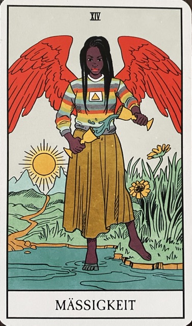 Die Mäßigkeit: Eine Karte des Ausgleichs und der Harmonie, des Zusammenführens und In-Balance-Haltens verschiedener, auch gegensätzlich Aspekte. Diese Karte schlägt die Brücke zur Position 1. Im Gegensatz zum bloßen Jonglieren der Gegensätze bei den Zwei Münzen wird bei der Mäßigkeit aber aus den gegensätzlich wirkenden Teilen etwas völlig Neues erschaffen. Hier geht es um Alchemie!