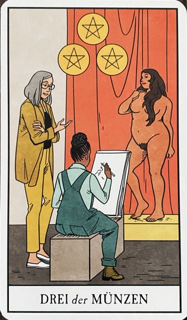 Drei der Münzen: Die Karte der kreativen Zusammenarbeit, des Voneinander-Lernens, des Teilens und Zuhörens. In fast allen Darstellungen verschiedener Tarot-Decks erschaffen die abgebildeten Personen gemeinsam etwas. Auf der hier verwendeten Karte ist eine Zeichenklasse mit Schülerin, Lehrerin und Modell zu sehen, in anderen zum Beispiel drei Baumeister, die gemeinsam an einem Spitzbogen arbeiten oder Freunde, die zusammen einen Teppich weben.