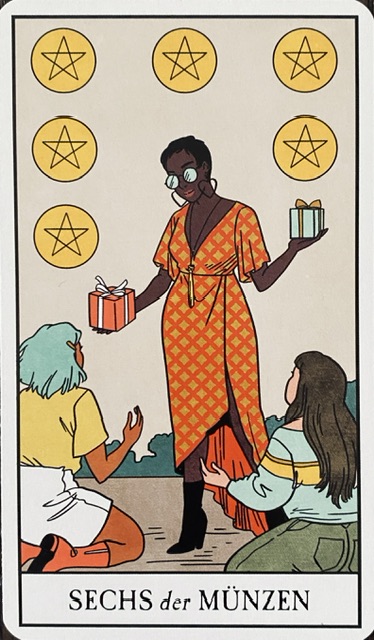 Sechs der Münzen: Hier geht es um Geben und Nehmen. Ist es ausgewogen? Die Karte zeigt eine Person, die Geschenke an vor ihr kniende Menschen verteilt (hier Päckchen, in klassischen Darstellungen oft Münzen). Aber sind es Bedürftige? Die Körperhaltung lässt darauf schließen, anhand der Kleidung lässt sich nicht ablesen, ob das Gegebene tatsächlich benötigt wird.