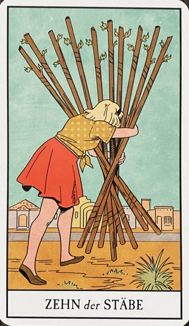 Zehn der Stäbe: Bei dieser Karte geht es darum, sich zu viel aufzubürden: Zu große Belastungen, zu viel Verantwortung, zu viel auf einmal. Die Notwendigkeit der Priorisierung bei der Bewältigung komplexer Aufgaben.