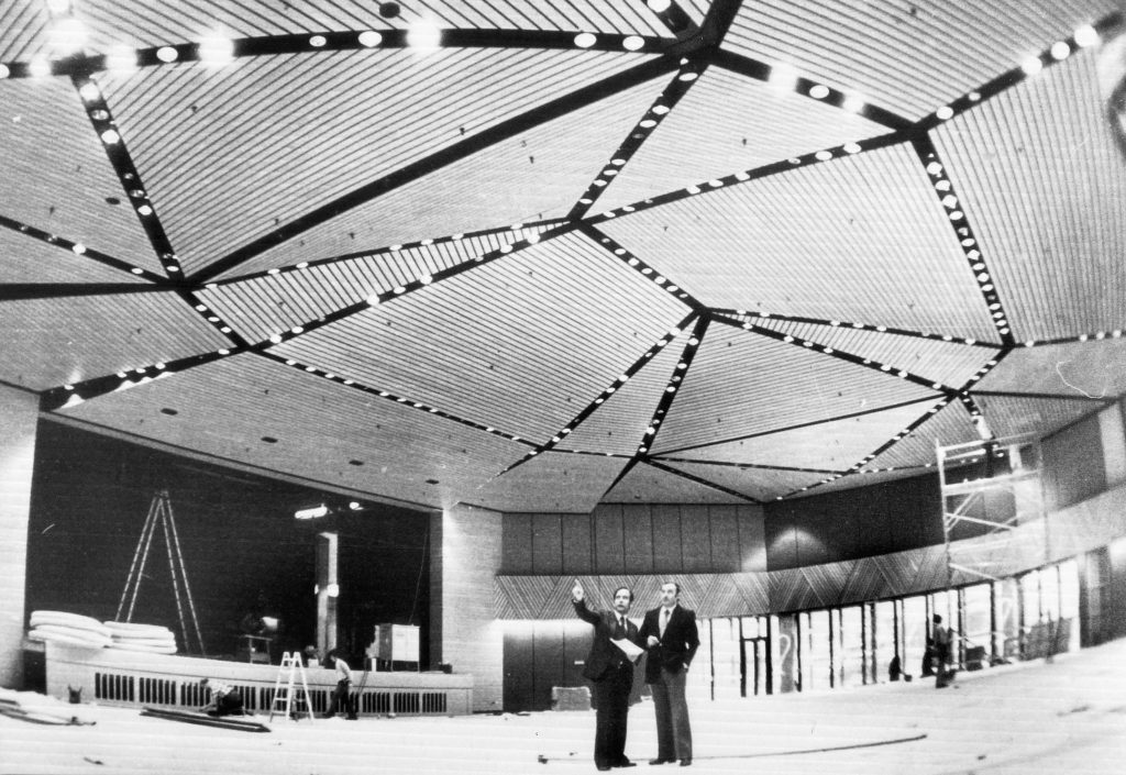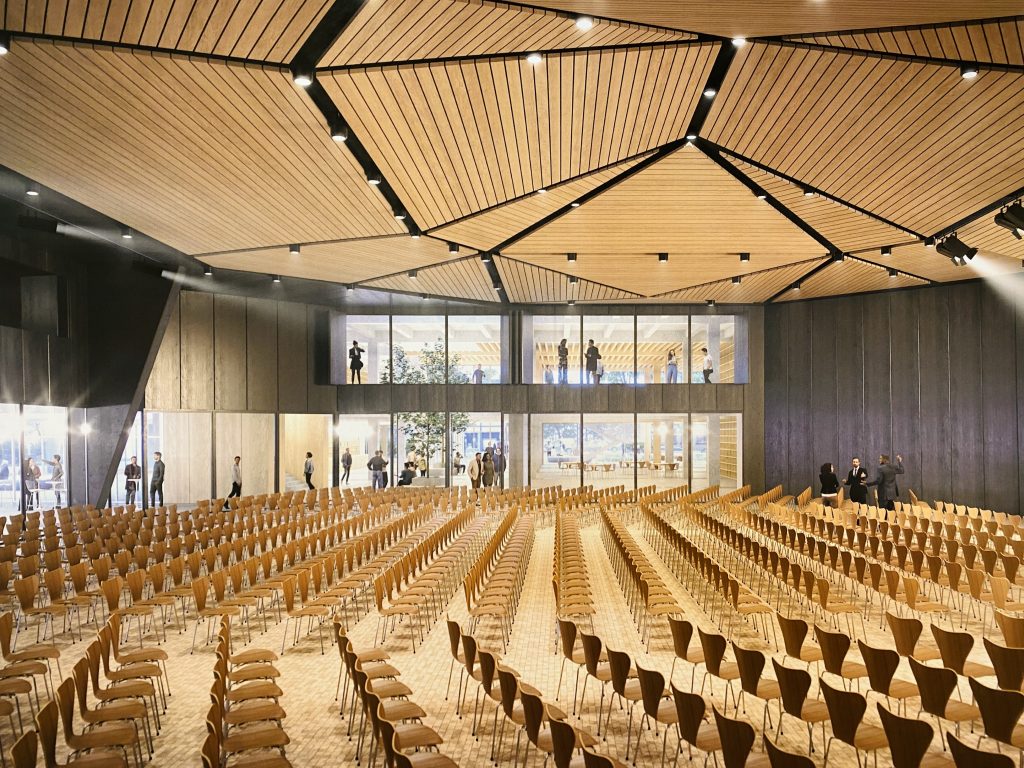 Der Veranstaltungsbereich behält seine achteckige Form, auch der Boden und die prägnante Deckengestaltung sollen bleiben. Der Raum öffnet sich aber mit verglasten Bereichen nach außen, wird heller und moderner. Er behält seine Größe und kann nach wie vor auf verschiedene Art bestuhlt und genutzt werden.