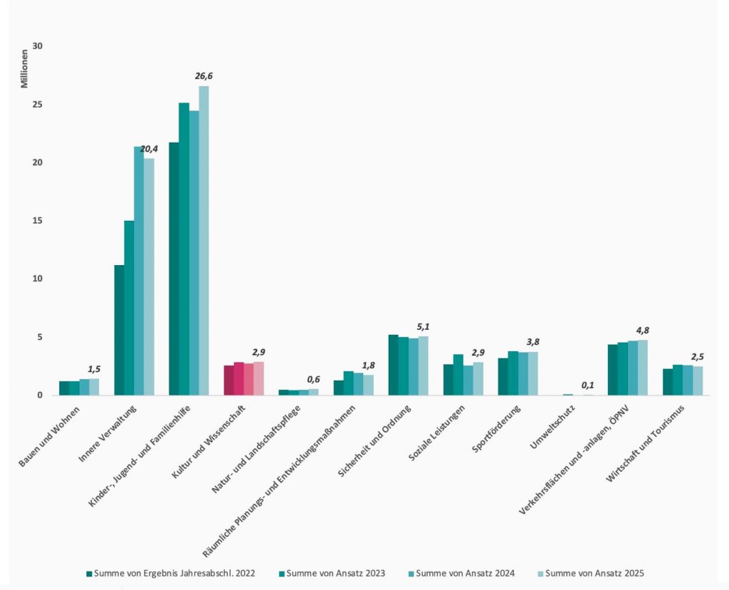 Knapp 3 Millionen gibt die Stadt für Kultur aus. Ein Blick auf die verschiedenen Bereiche des städtischen Haushalts zeigt, dass Einsparungen bei der Kultur nicht die Rettung für unseren Haushalt bedeuten würden. Der Anteil an den Gesamtausgaben ist gering, vor allem mit Blick auf die riesigen Posten ‘Innere Verwaltung’ und ‘Kinder-, Jugend- und Familienhilfe’. Alle “kleinen” Bereiche zusammengenommen kommen etwa auf die Ausgaben des Spitzenreiters mit 26,6 Millionen.
