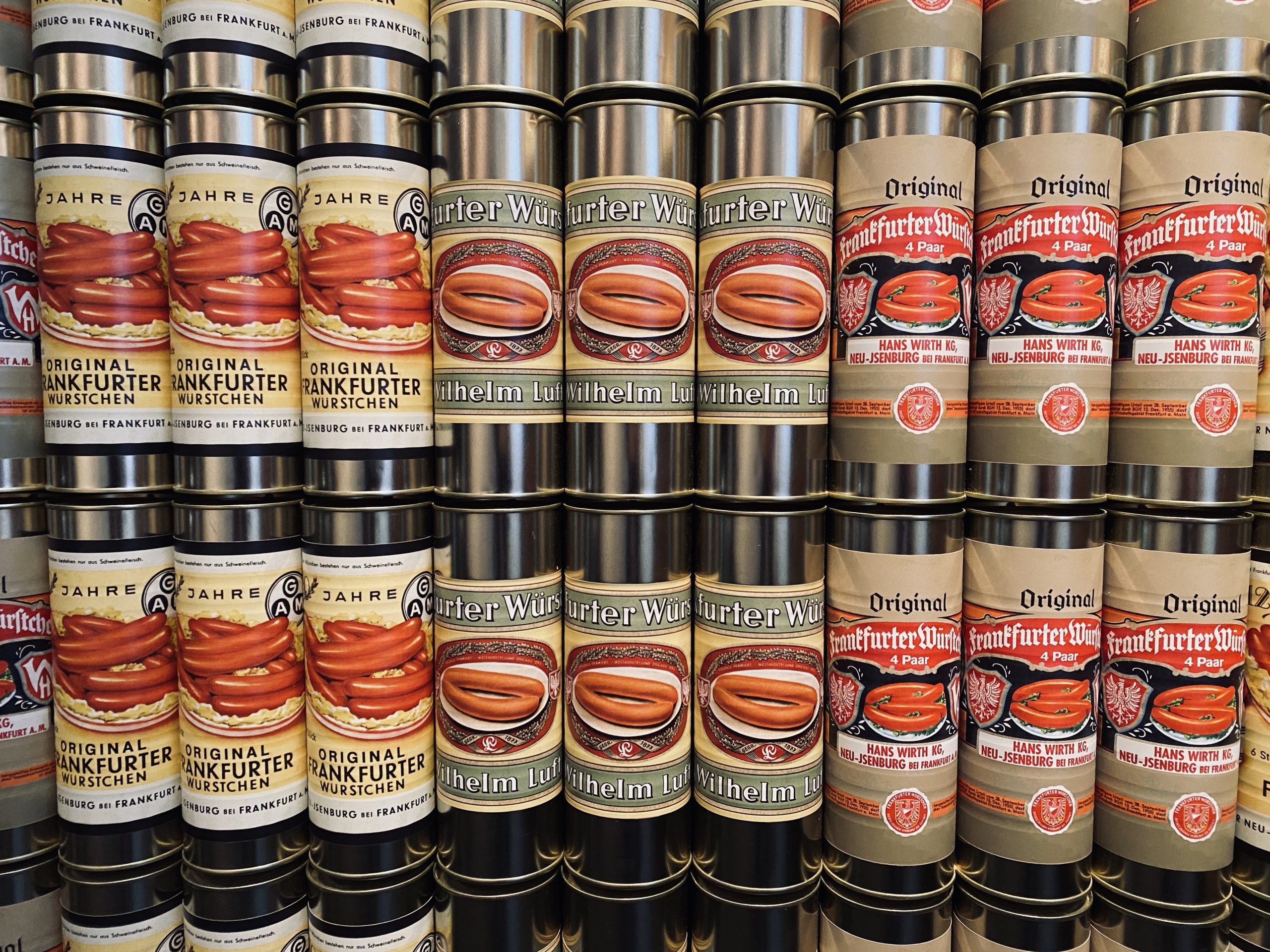 Und dann war da noch das Rätsel um die Wurst: Warum schrieb Wilhelm Luft einfach nur ‚Frankfurter Würstchen‘ auf seine Dosen, während die Hersteller Wirth und Müller sie als ‚Original Frankfurter Würstchen aus Neu-Isenburg bei Frankfurt‘ kennzeichnen mussten? Eine in Neu-Isenburg gerne weitererzählte urbane Legende besagt, dass für die Kennzeichnung als ‚Frankfurter Würstchen’ mindestens ein Arbeitsschritt in Frankfurt erfolgen muss und dass vermutlich ein Mitarbeiter der Firma Luft auf den Lieferwagen kletterte und die Etiketten jenseits der Stadtgrenze vor der Auslieferung noch schnell auf Frankfurter Gebiet auf die Dosen klebte. Als die ehemalige Wurstfabrik Luft (später das Branntweinmonopol) kürzlich im Rahmen der Bauarbeiten zum neuen Stadtquartier Süd in den Fokus der Aufmerksamkeit rückte, wurde der Stadt eine Sammlung von Fotos aus einem Nachlass angeboten, die genau das bestätigten: die Würstchendosen wurden tatsächlich zum Etikettieren nach Frankfurt gefahren!
