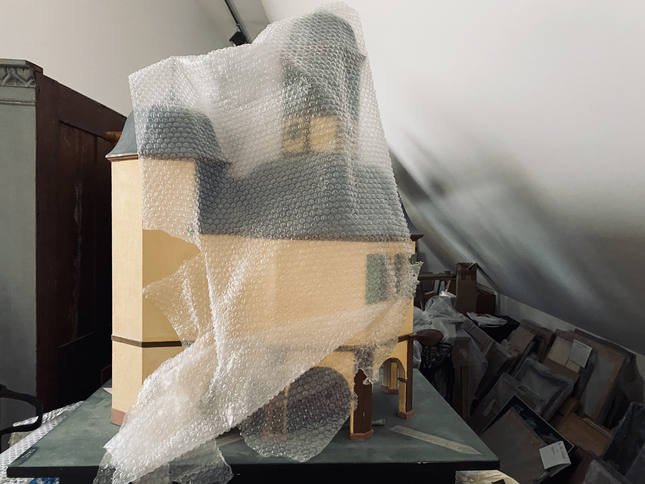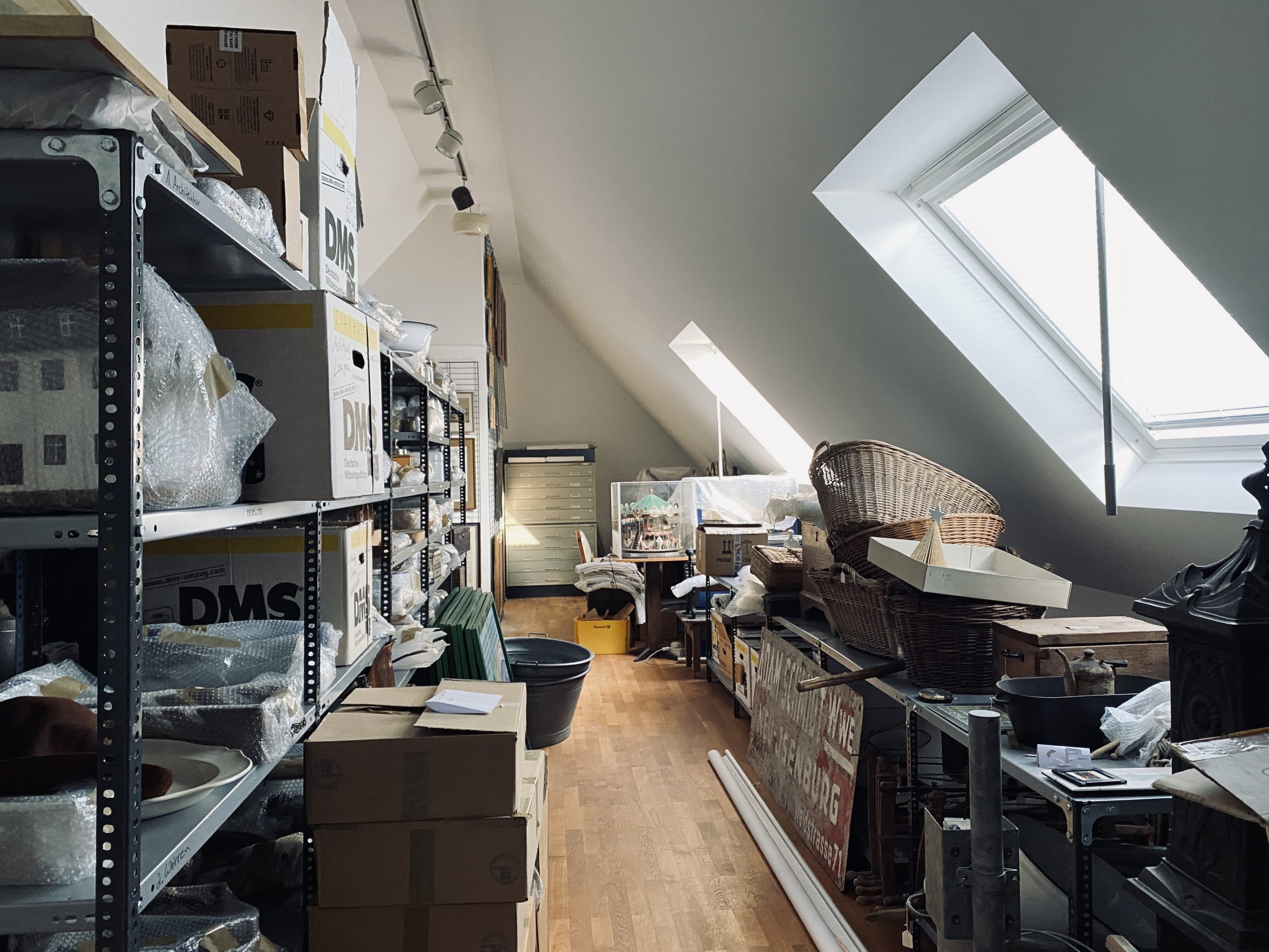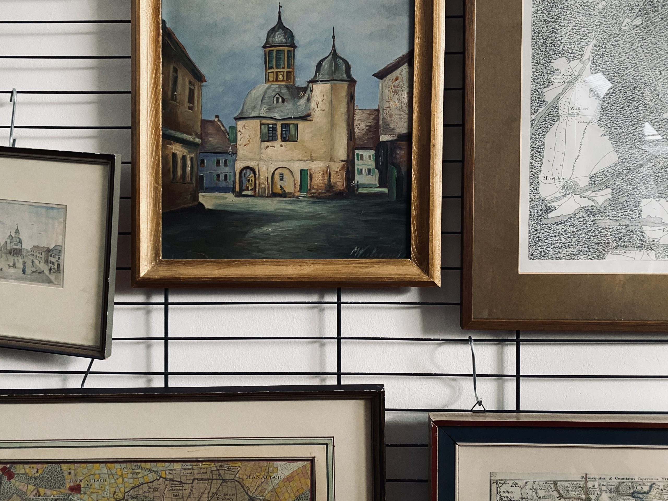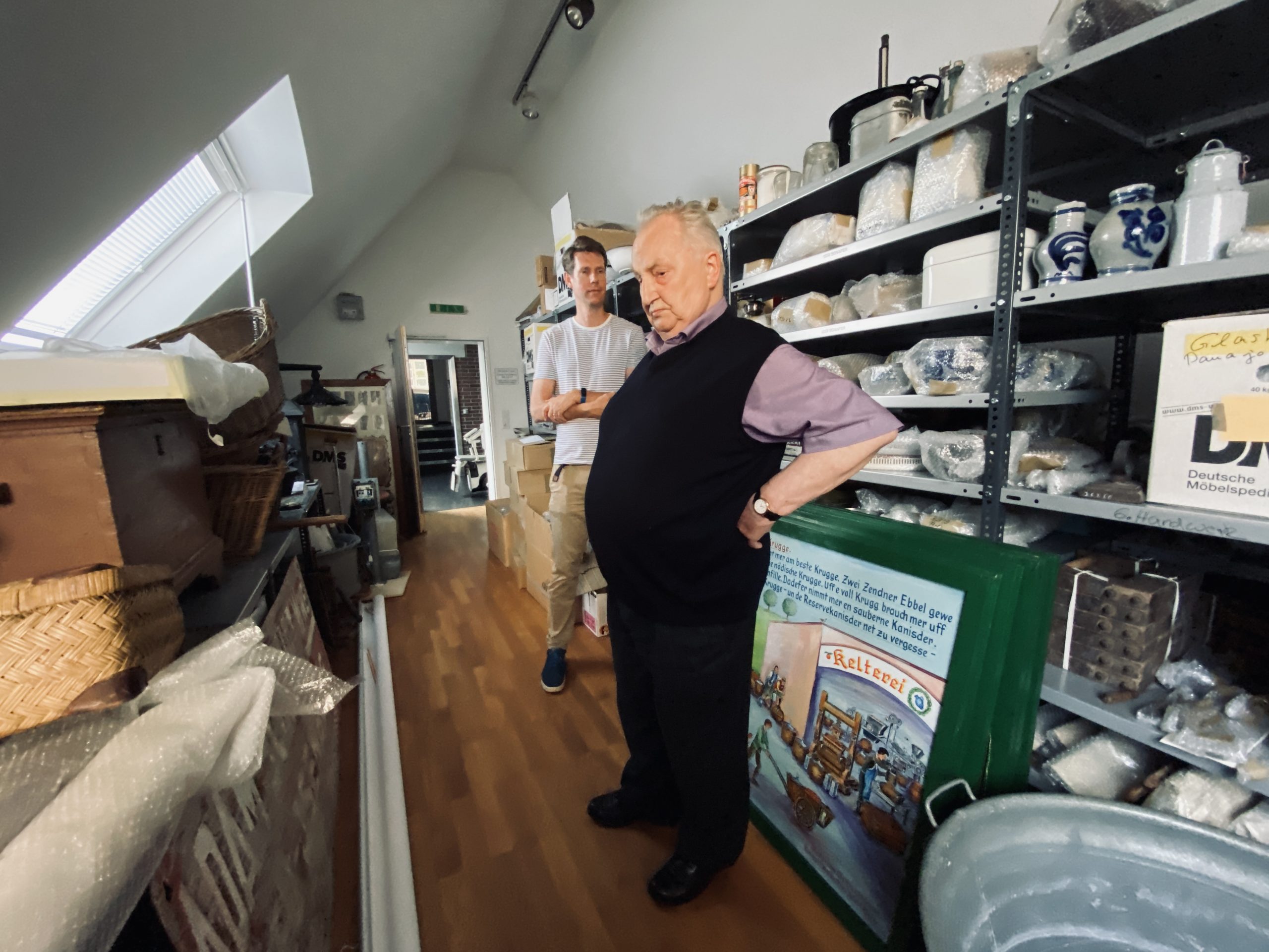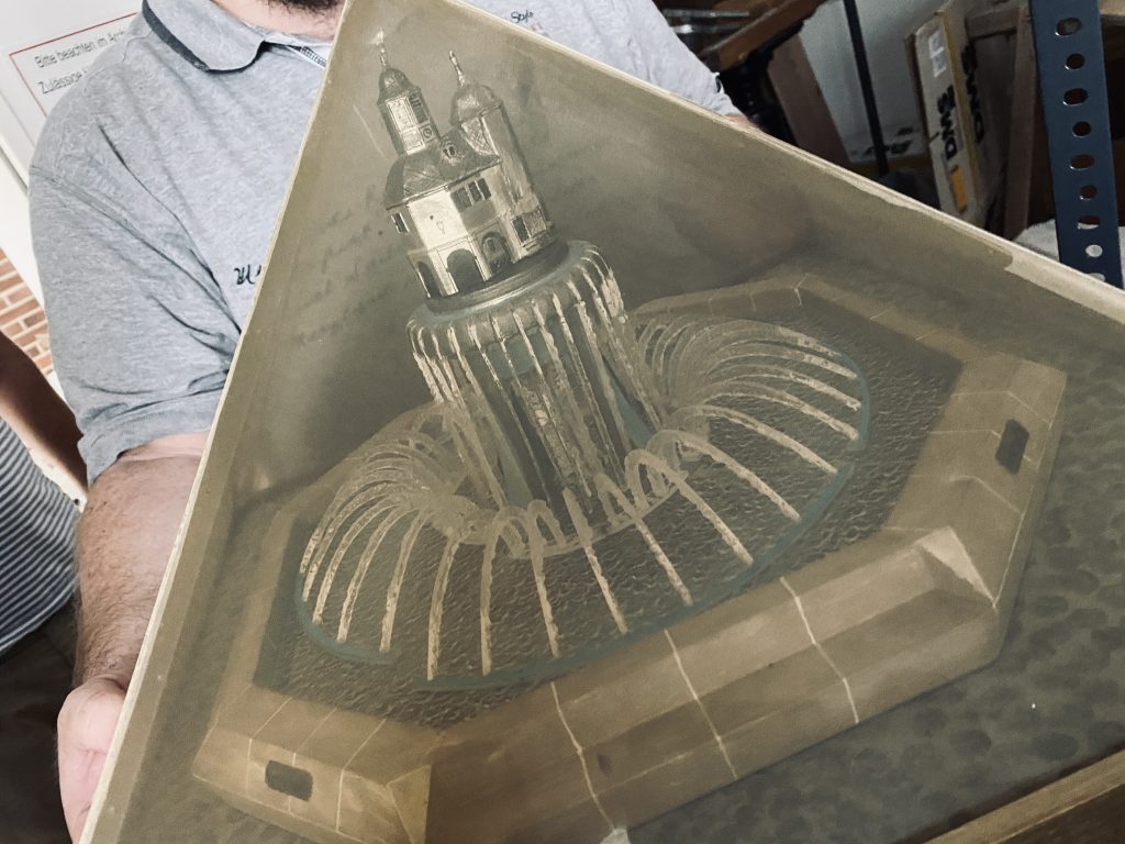 Im Depot des Museums werden Objekte eingelagert, die aktuell in keiner Ausstellung zu sehen sind. Jedes einzelne Objekt wird katalogisiert, fotografiert und mit einer Nummer versehen, bevor es ins Regal wandert. Neben vielen Haushaltgegenständen, Schildern, Werkzeugen und Möbeln entdeckten wir hier auch ein weiteres Modell des Alten Rathauses (eins steht in der Dauerausstellung), die Spitze des historischen Original-Rathauses und ein sehr interessantes Modell eines Entwurfs für einen Marktplatz-Brunnen, den der Neu-Isenburger Maler Willi Kohl bereits in den 60er oder 70er Jahren angefertigt hatte. Der monumentale Brunnen mit Wasserspielen scheint fast den gesamten Platz einzunehmen, auf der Spitze thront ein großes Modell des Hugenottenrathauses. Mit Christian Kunz hatten wir uns bereits im letzten Jahr darüber unterhalten, welche Gestaltung des Marktplatzes aus Sicht des Museums optimal wäre. Er erläuterte uns gestern nochmals, dass aus stadthistorischer Sicht eine romantische Rückbesinnung zu Altem zwar nachvollziehbar sei, dass eine Stadt aber immer von natürlicher Weiterentwicklung lebt. Aus museumspädagogischer Sicht wäre eine Gestaltung wünschenswert, bei der für Führungen und Rundgänge die Sichtachsen erhalten bleiben. Und für den Kulturbereich der Stadt Neu-Isenburg gilt: Auch in Zukunft wird für die beliebten Märkte und Feste ausreichend freie Fläche auf dem Marktplatz benötigt.