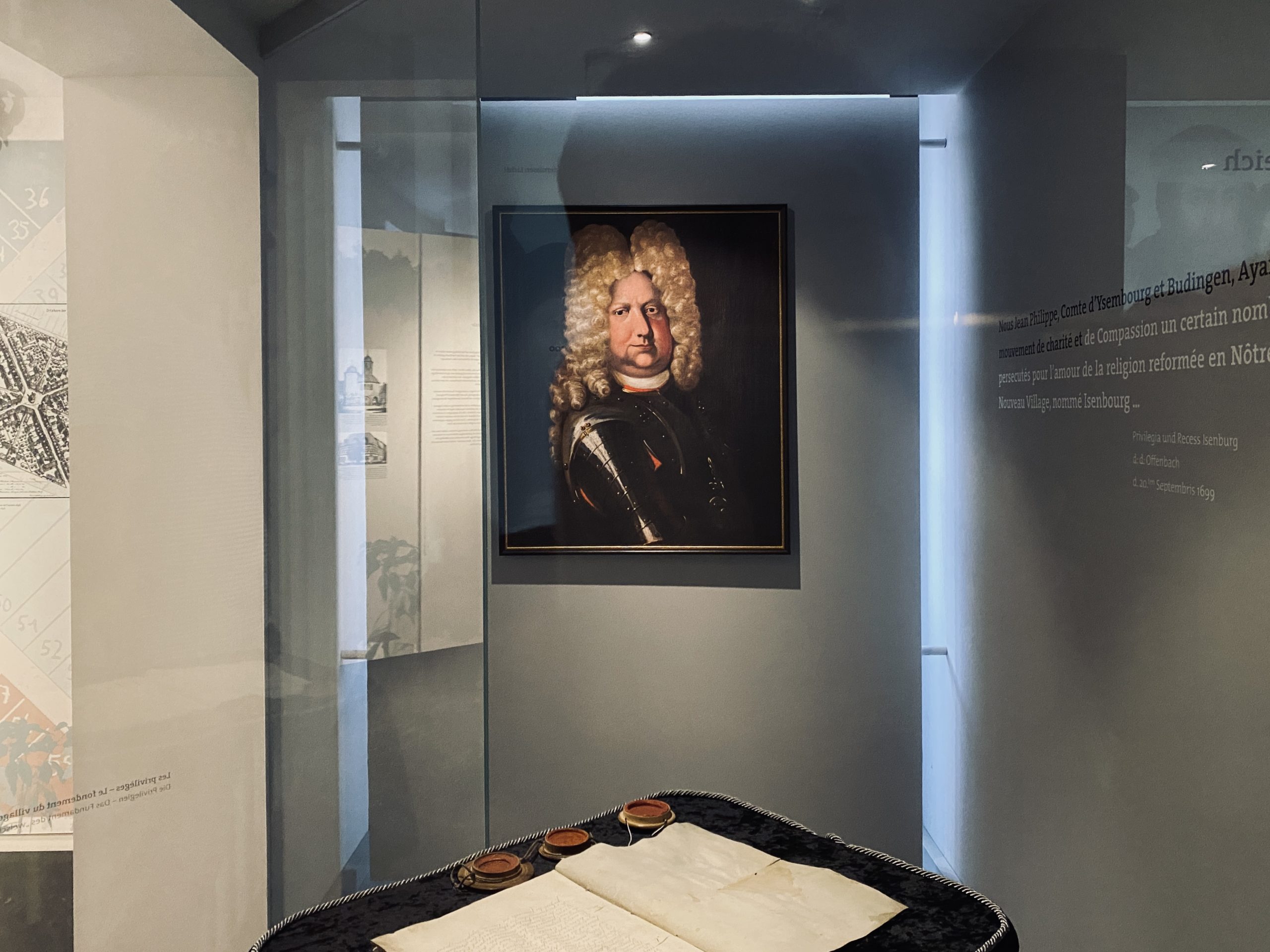 Das Portrait unseres Stadtgründers Graf Jean-Philippe hängt normalerweise im Marstall des Birsteiner Schlosses. Unser Stadtmuseum hatte das Ölgemälde gerade von dort ausgeliehen, um eine Kopie anfertigen zu lassen, als ein Brand in diesem Bereich des Schlosses viele wichtige Objekte und Kunstwerke zerstörte. Wir Neu-Isenburger haben also unseren Stadtgründer vor den Flammen gerettet!