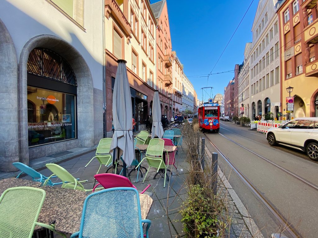 Die sehr schöne Braubachstraße liegt in der Frankfurter Innenstadt und präsentiert ein vielfältiges Angebot an Gastronomie, Galerien und kleinen Läden. Wer ausprobieren möchte, wie sich ein Besuch im Straßencafé mit vorbeifahrender Straßenbahn anfühlt, ist hier richtig.