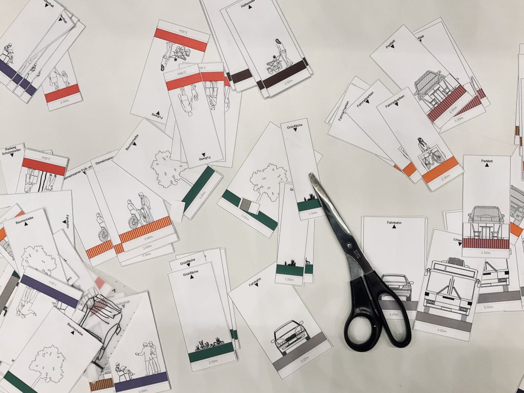 Die Zusammenarbeit in den Teams verlief harmonisch und konstruktiv, das Experimentieren mit den Kärtchen verdeutlichte sehr gut, was machbar ist und wo Probleme auftauchen könnten. Hätten Sie zum Beispiel gedacht, dass eine einspurig geführte Straßenbahn mehr Platz benötigt als eine zweispurige? Der Grund: Wenn es Gleise in beide Richtungen gibt, können Bahn und Autos sich in jeder Richtung die Spur teilen. Auf dem einspurigen Gleis ändert sich die Fahrtrichtung. Es kann deshalb nicht zusätzlich als Fahrbahn genutzt werden und eine weitere Spur für jede Richtung wird benötigt. Mit einer solchen Lösung müsste in der Frankfurter Straße an anderer Stelle Platz eingespart werden. Das könnte zu Lasten von breiteren Gehwegen, grünen Inseln oder Parkplätzen gehen.