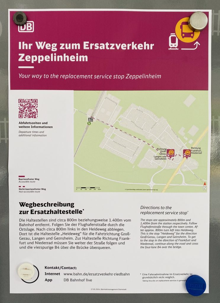 Aber es gibt auch Herausforderungen. Da wäre zuerst die Erreichbarkeit der Ersatzhaltestelle Wilhelm-Haas-Platz. Der Haltepunkt für den Ersatzbus in Richtung Frankfurt (Richtung Süden: Haltestelle Heideweg!) liegt jenseits der B44 und kann nur über eine Brücke mit Treppe erreicht werden. Das ist für Rollstuhl, Kinderwagen, Fahrrad und Rollator nicht machbar. Für blinde und sehbehinderte Personen bietet die Bahn eine Wegbegleitung an, die über db.de/wegbegleitung erreicht werden kann. Vielleicht könnte hier auch eine Möglichkeit geschaffen werden, Personen mit körperlicher/motorischer Einschränkung zu helfen. Da das Tragen von Gefährt und Insassen auf der Treppe aber schwierig und gefährlich ist, bliebe vermutlich nur eine Fahrt mit einem behindertengerechten Fahrzeug auf die andere Straßenseite. In diesem Fall könnte der barrierefreie Hopper – trotz aller Einschränkungen – die einfachere Alternative sein.