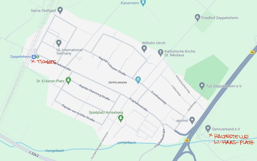 Eine weitere Schwierigkeit kann der Fahrkartenkauf darstellen. Der Erwerb über die RMV-App ist zwar möglich, wer das aber nicht hinkriegt und eine Fahrkarte auf Papier kaufen möchte, kann das nicht beim Fahrer tun, sondern muss den Fahrkarten-Automaten aufsuchen. Blöderweise befindet der sich nach wie vor am Bahnhof – die Ersatzhaltestelle aber genau am anderen Ende von Zeppelinheim. Ob hier eine Alternative geschaffen werden kann, haben wir bei der Bahn am Infomobil erfragt, warten aber noch auf Antwort.