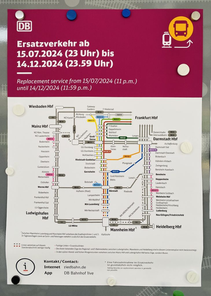 Wenn eine komplette, 70 km lange, zweigleisige Bahnstrecke ausfällt, muss der Betreiber sich etwas einfallen lassen und die Bahn war hier durchaus kreativ. Ein umfangreicher Ersatzverkehr mit modern ausgestatteten Bussen wurde geplant, der bestehende Linien miteinander verbindet, aber auch Verknüpfungen schafft, die es bisher nicht gab – so ist es zum Beispiel möglich, von Zeppelinheim aus mit dem Bus Q2 direkt nach Langen zu fahren. Für die durch die Einschränkung der Linie OF-52 sonntags buslosen Zeppelinheimer vielleicht sogar vorübergehend ein praktikabler (Um-) Weg in die Kernstadt: Die Fahrt von Zeppelinheim nach Langen dauert zwar etwa 30 Minuten, der Ersatzbus fährt aber täglich im Halbstunden-Takt und hält in Langen direkt am Bahnhof, von wo die S-Bahnen S3 und S4 in 7 Minuten zum Bahnhof Neu-Isenburg fahren. (Fahrplan hier!)