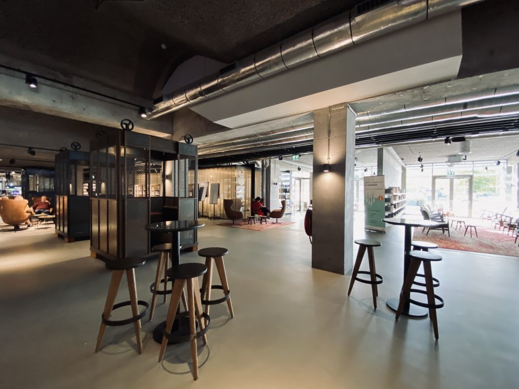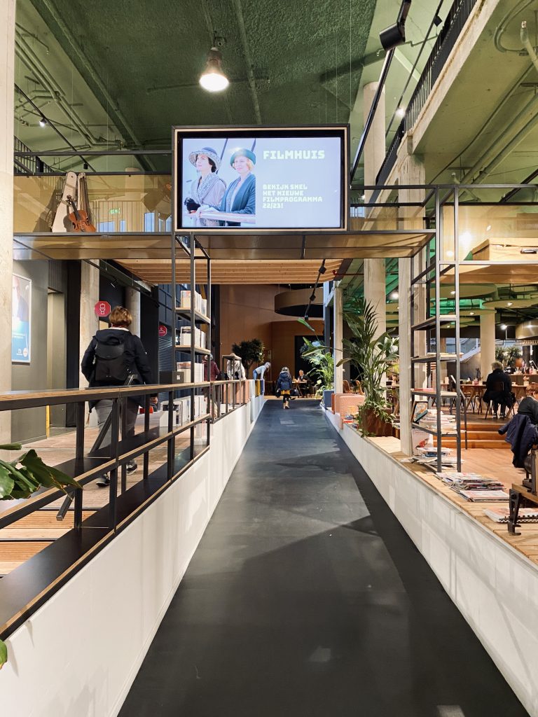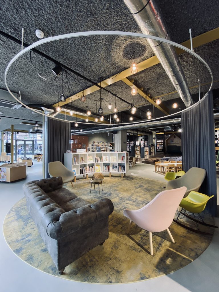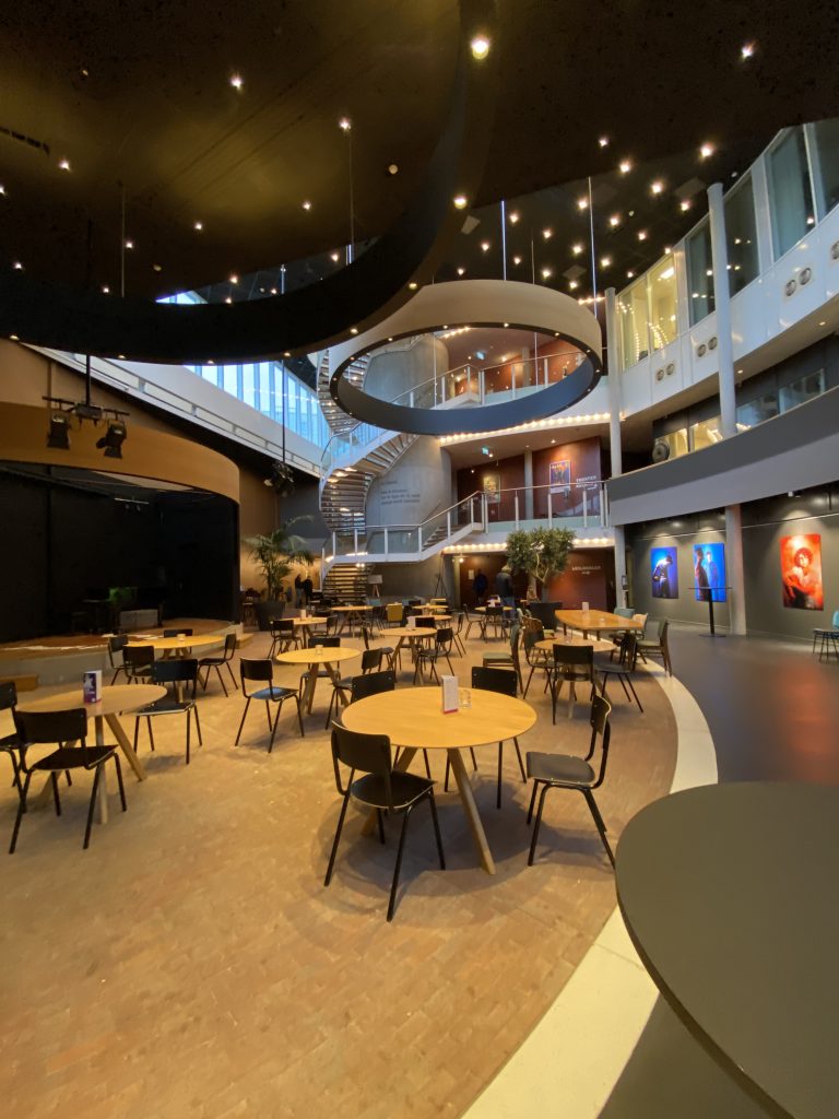 Eine Bibliothek, ein Theater, eine Galerie, eine Musikschule, ein Kunstzentrum, ein Makerspace und ein Café bilden auf etwa 10.000 Quadratmetern gemeinsam das Zentrum für Kunst und Kultur in Ede. Die Kernstadt hat etwa 70.000 Einwohner, alle Stadtteile zusammen 120.000. Unter der kreativen Leitung des Architekten Aat Vos, Spezialist für die Umgestaltung von Bibliotheken, Theatern, Kulturhäusern wurde ‚Cultura’ in zu einem modernen Dritten Ort umgebaut. Alle Bereiche arbeiten hier zusammen, die räumliche Trennung ist aufgehoben – doch bis hin zum echten interdisziplinären Arbeiten war es ein jahrelanger Prozess, erzählte uns der Leiter des Weiterbildungsbereichs Rutger Schehrer. In einer umfangreichen Führung besichtigten wir Bereiche der Bibliothek, das Café, eine Töpferwerkstatt, ein Maler-Atelier, die kleine Studiobühne und (heimlich bei einer Generalprobe) das Theater. Auch das Back-Office, die Garderoben und individuell gestaltete Besprechungsräume für verschiedene Anforderungen gehörten dazu. 21,7% aller Einwohner sind Mitglied des Zentrums. Umgerechnet auf Neu-Isenburg wären das über 8.600 Personen.
